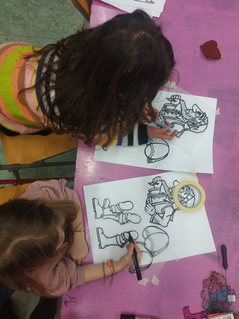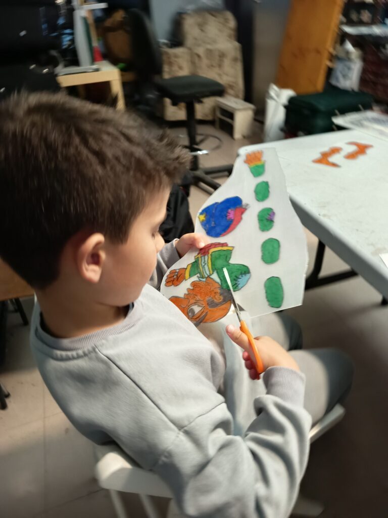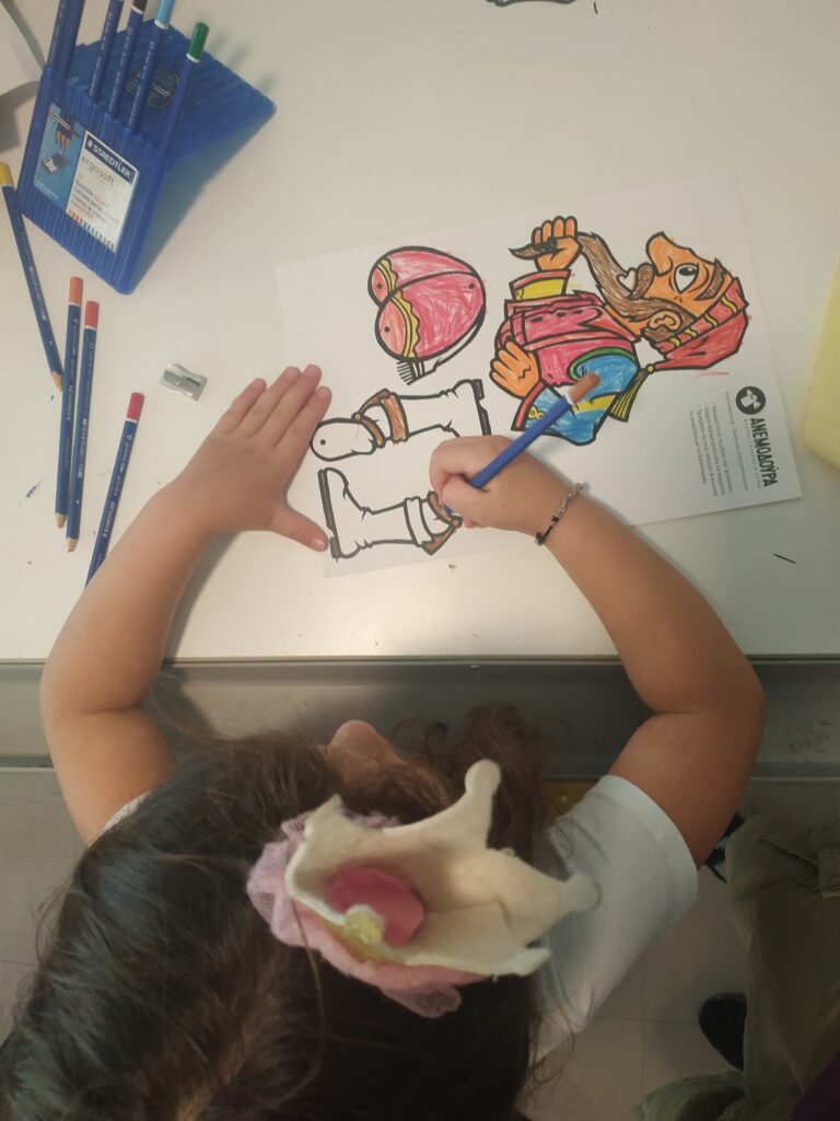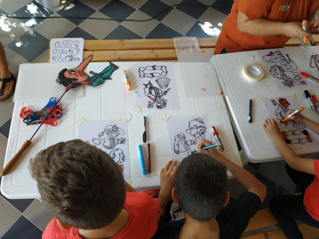 Κατασκευάζουν τις δικές τους φιγούρες από πλαστικό και παίζουν με αυτές πίσω από το λευκό πανί του μπερντέ. Μαθαίνουν για τον χαρακτήρα, την καταγωγή, την ενδυμασία, τη διάλεκτο και τη φωνή κάθε χαρακτήρα. Τα παιδιά γίνονται μικροί καραγκιοζοπαίχτες και πειραματίζονται μέσα από τις κλασικές κωμωδίες του ντύνοντας τες όμως με το δικό τους τρόπο και τα δικά τους καλαμπούρια.