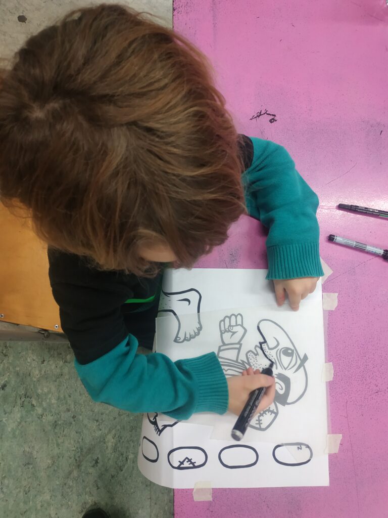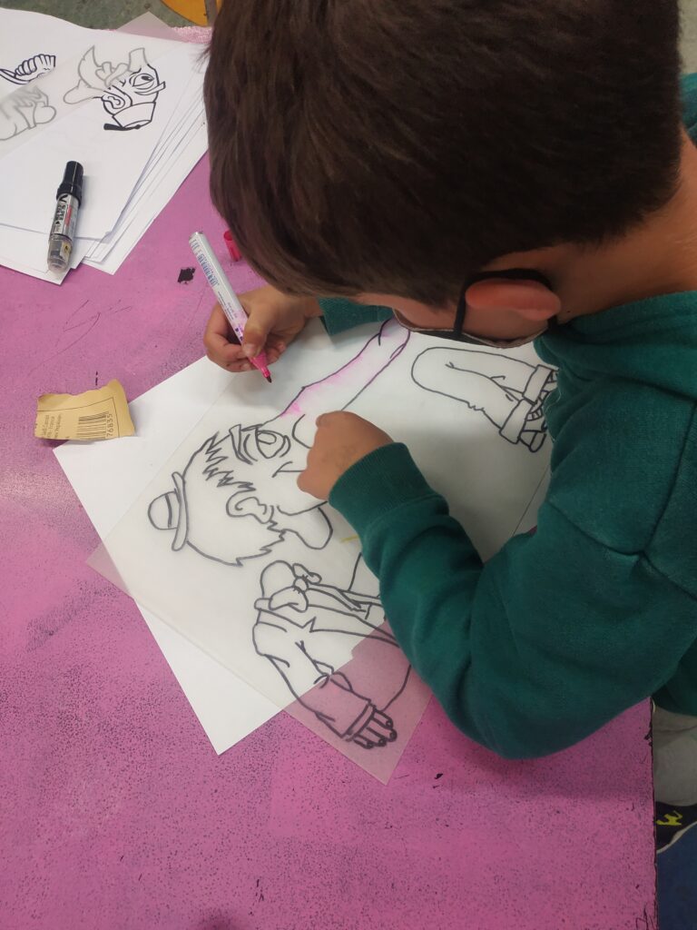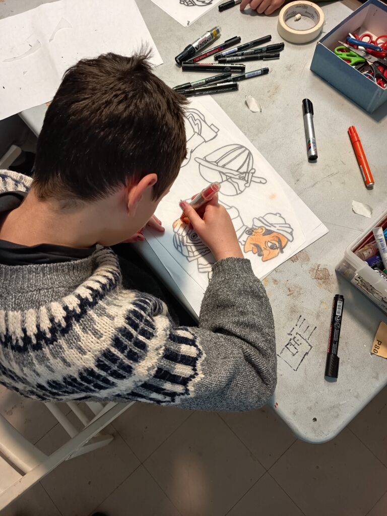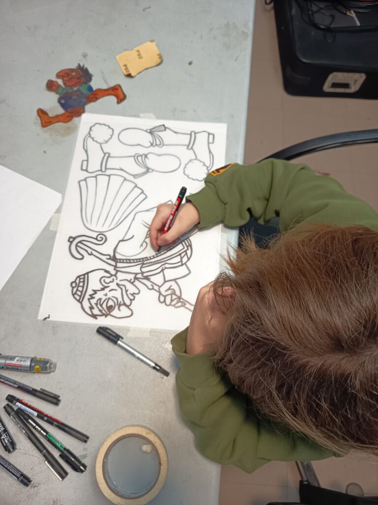 Κατασκευάζουν τις δικές τους φιγούρες από πλαστικό και παίζουν με αυτές πίσω από το λευκό πανί του μπερντέ. Μαθαίνουν για τον χαρακτήρα, την καταγωγή, την ενδυμασία, τη διάλεκτο και τη φωνή κάθε χαρακτήρα. Τα παιδιά γίνονται μικροί καραγκιοζοπαίχτες και πειραματίζονται μέσα από τις κλασικές κωμωδίες του ντύνοντας τες όμως με το δικό τους τρόπο και τα δικά τους καλαμπούρια.